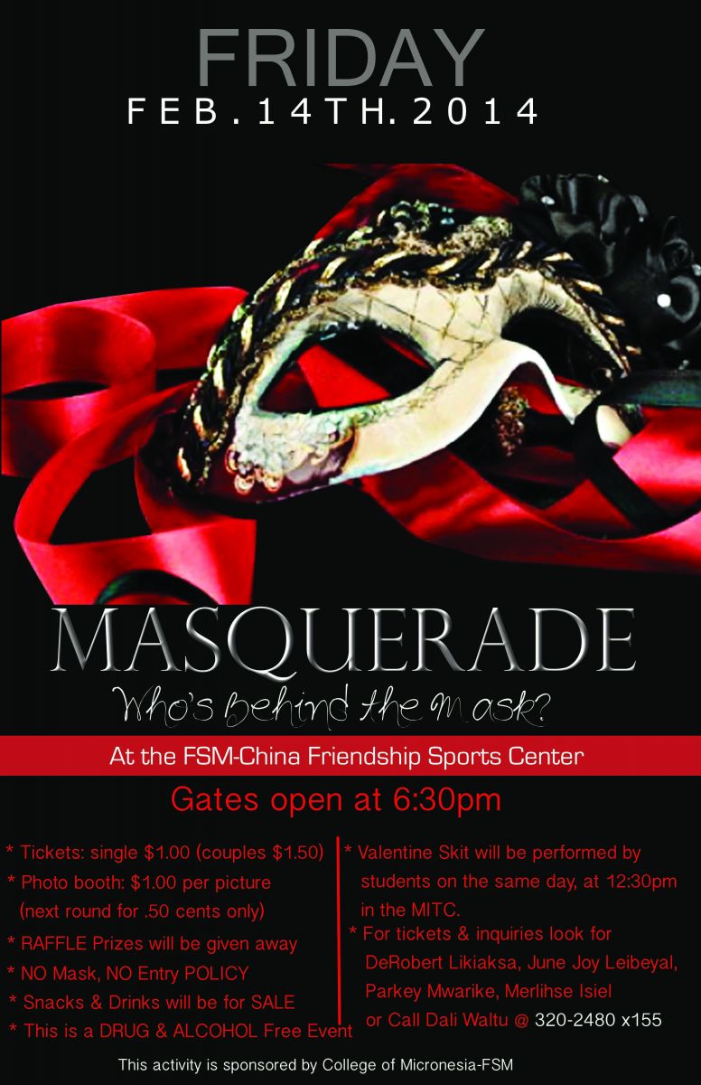 The National Campus Peer Advisers will be hosting a Masquerade Ball on Friday, February 14, 2014, at the FSM-China Friendship Sports Center. Door opens at 6:30pm, tickets are being sold for $1.00 and $1.50 for couples.